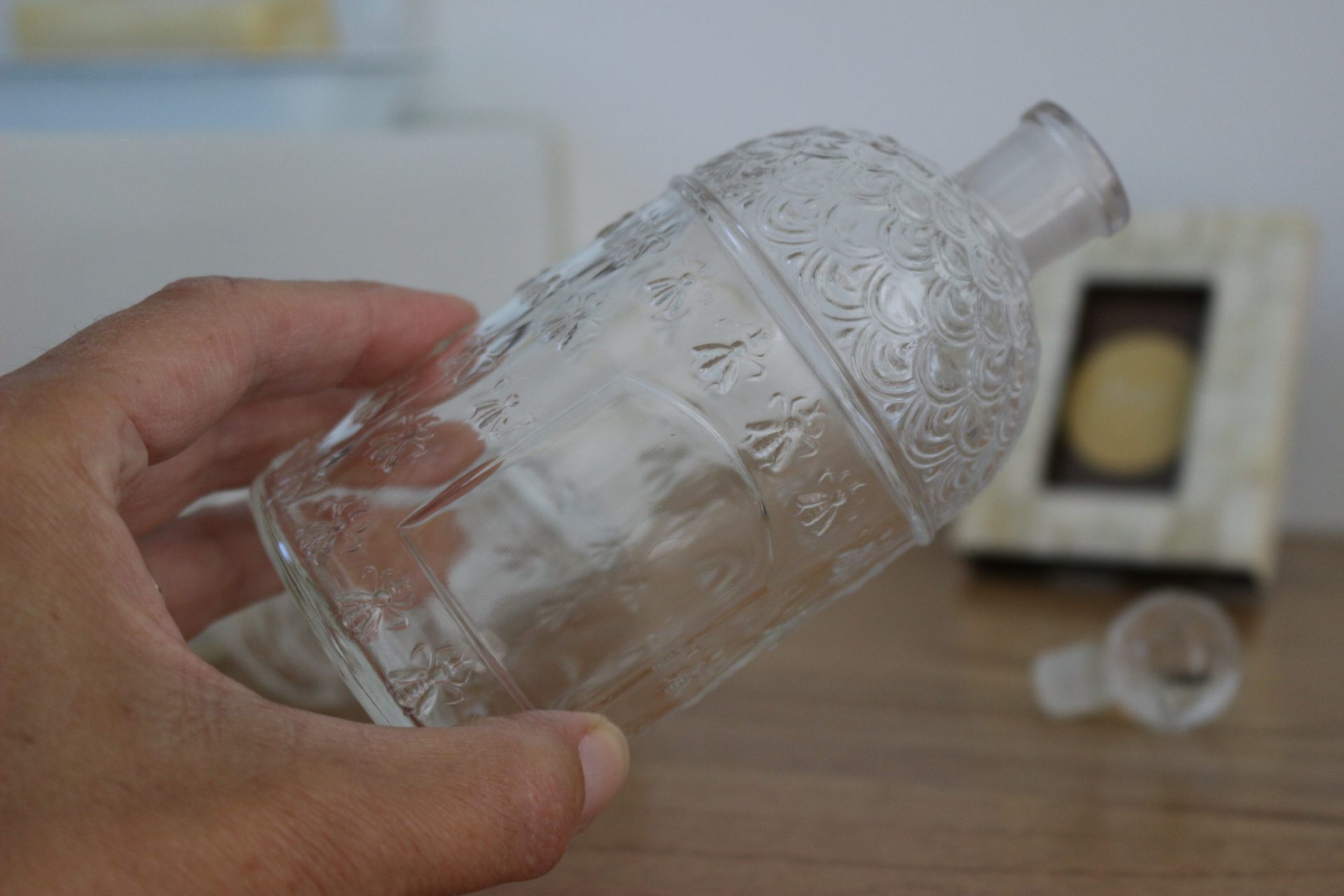 Réalisé par la Verrerie française Pochet & Du Courval en 1853, ce flacon aux abeilles, symbole de l’Empire, est devenu la signature des parfums de la maison française. Chaque courbe, chaque motif capte la lumière d’une manière unique, transformant ce flacon en une petite sculpture lumineuse. Bien qu’il soit vide aujourd’hui de son précieux élixir, il demeure imprégné de l’aura de luxe et de sophistication propre à Guerlain.
