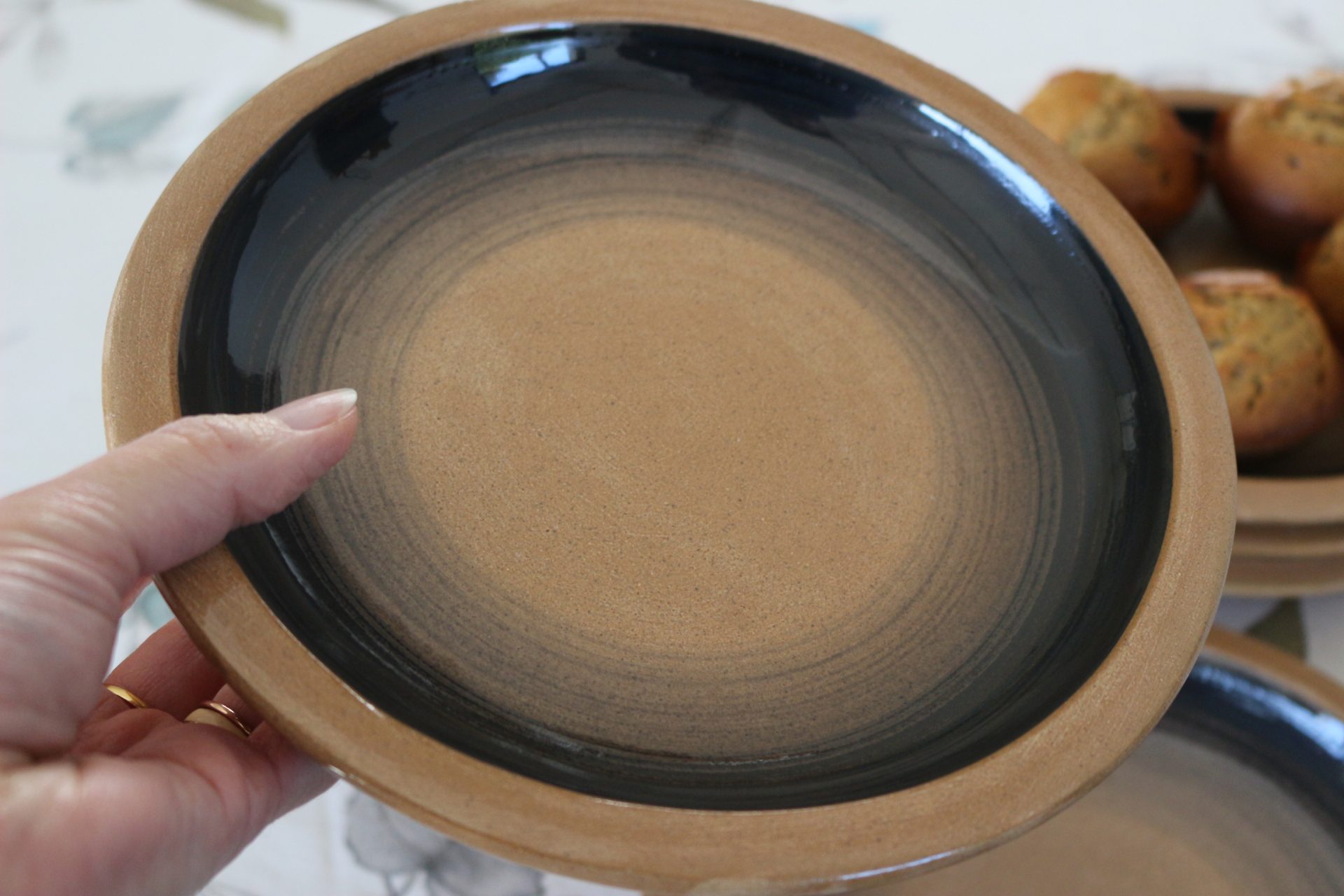 Chaque assiette décline les nuances profondes de marron et de noir, dans un jeu de dégradés et de textures qui évoque les paysages terriens et les mystères de la matière brute. La forme creuse et ronde est parfaite pour accueillir des potages réconfortants, des pâtes gourmandes, ou des salades généreuses, transformant chaque plat en un tableau vivant.