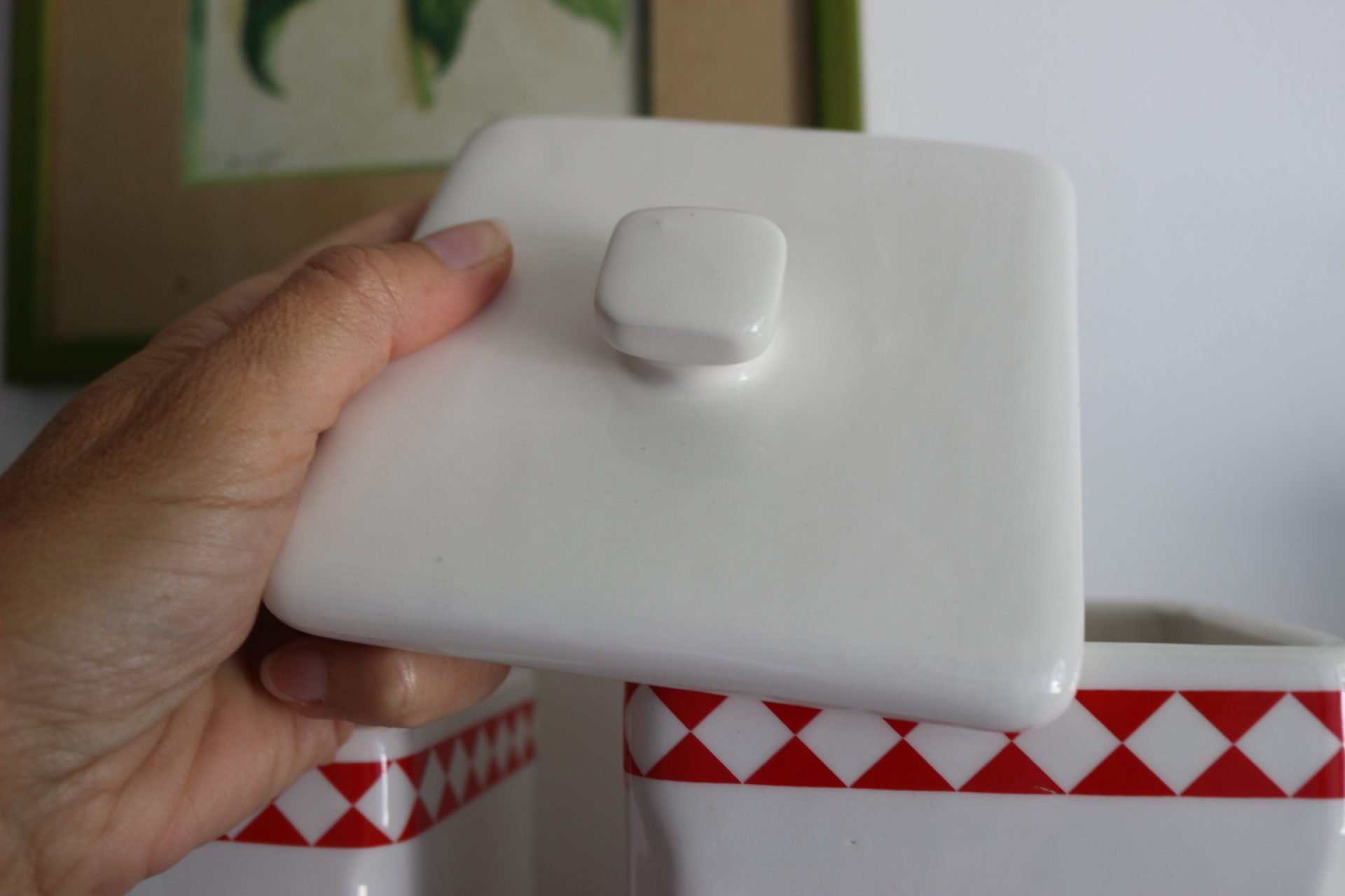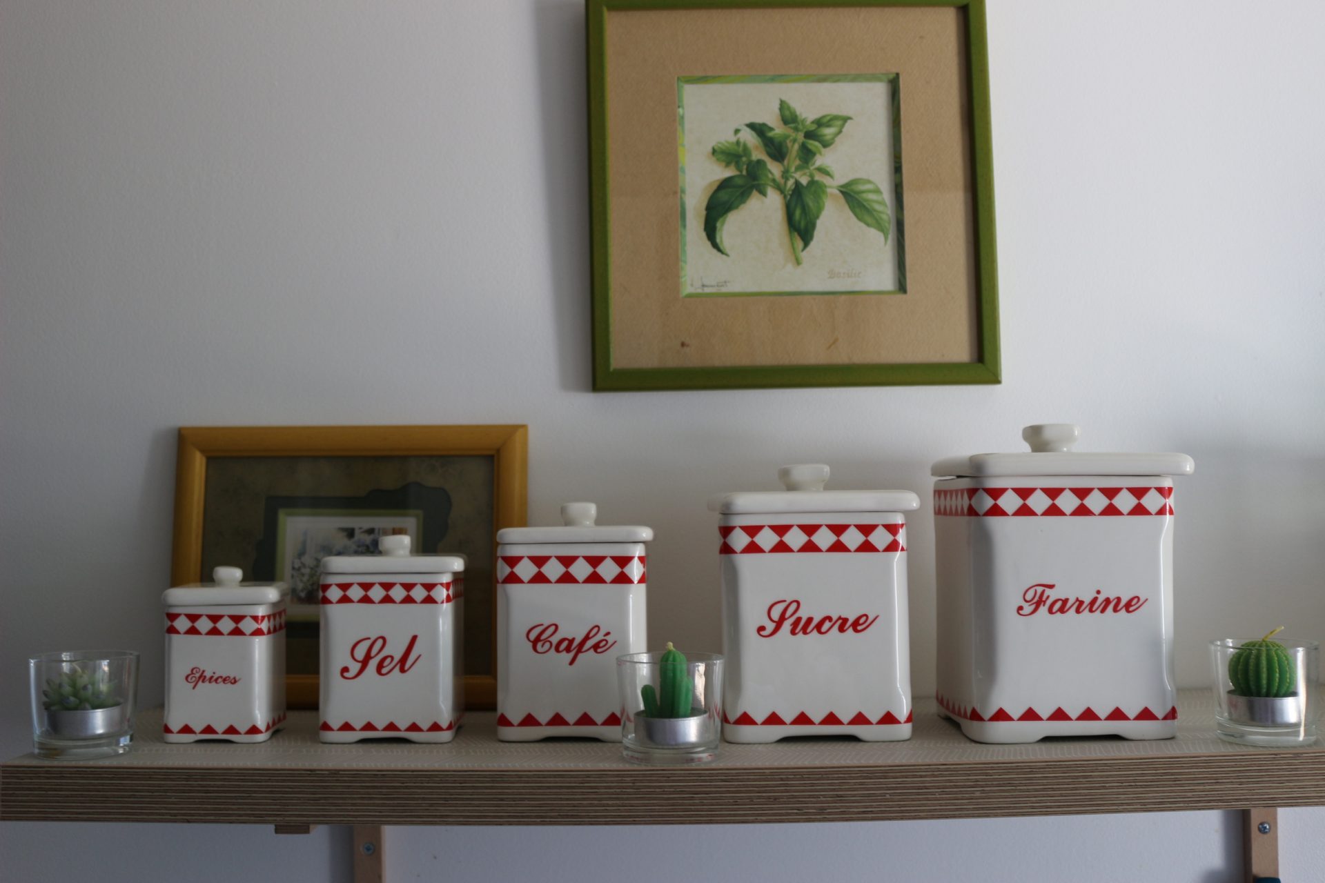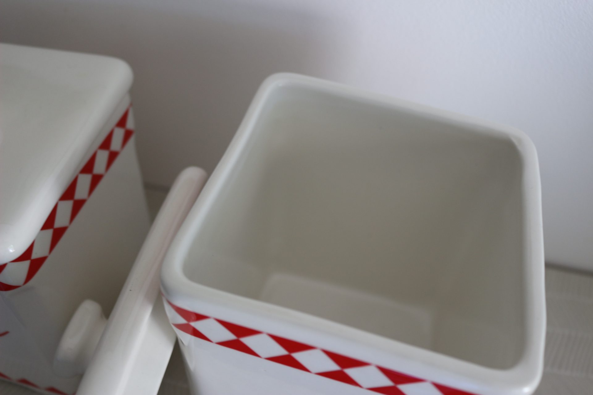 Chaque pot se distingue par son élégant fond blanc cassé, une teinte douce et chaleureuse qui apporte luminosité à votre plan de travail. La frise rouge qui orne le pourtour de chaque pot est un clin d’œil vibrant au design rétro, ajoutant une touche de gaieté et de dynamisme.