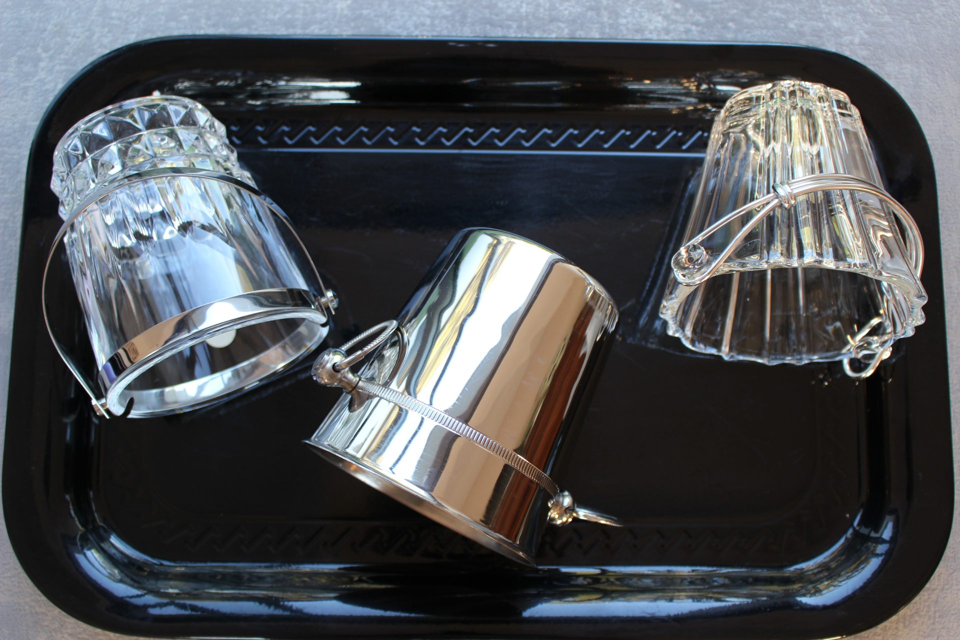 Georges est en inox de la marque Jean Couzon, en parfait état.Victor est en cristal cerclé de métal et Damien est en cristal moins classique avec une anse en métal argenté comme noué, tous aussi jolis les uns que les autres.
